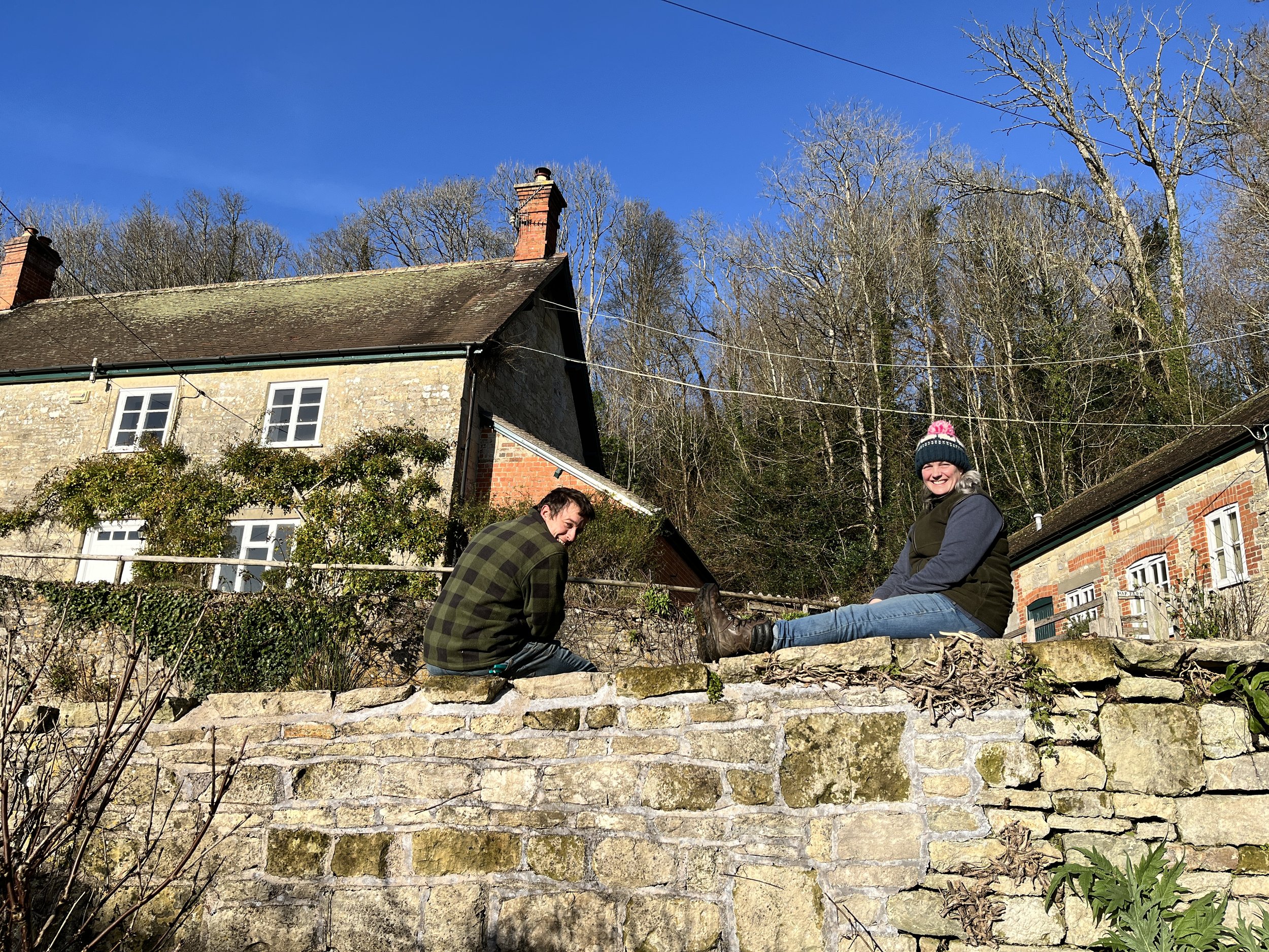 A rare photo of the two of us, and sitting down too! Rosemary, who took the photo is one of our favourites. Her cottage is stunning and she is an avid gardener and you can’t help peer over the wall and see what she’s been propagating. If she’s there she will always have a natter. She has been watching the ewes from her garden these past few weeks enjoying them relaxing in the field in front of her garden.