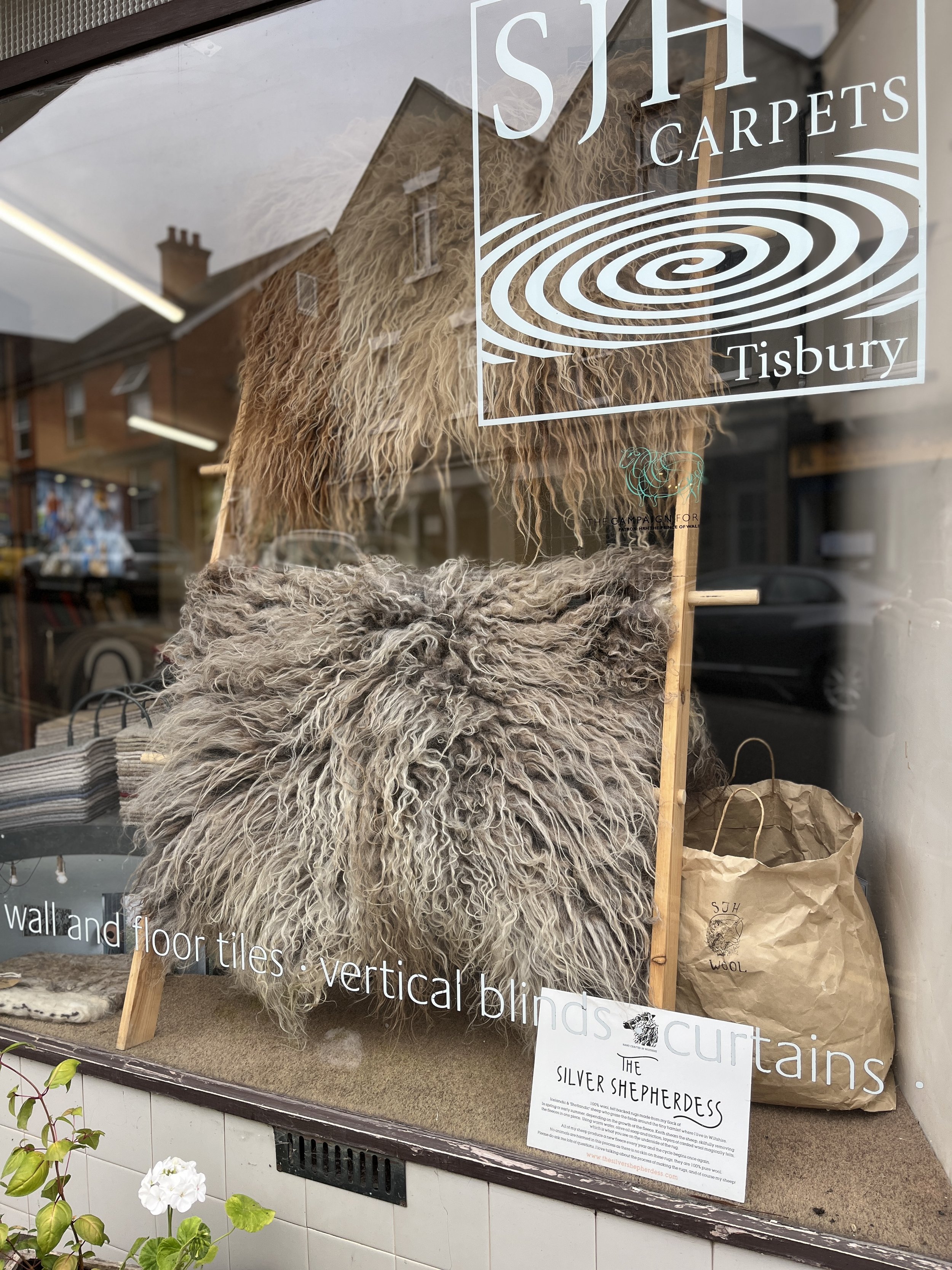 I’m super grateful that my rugs are on display thanks to John at SJH Carpets in Tisbury. There’s a good footfall in the High Street and its only a few miles from where I make them. And the girls in the shop are fab!